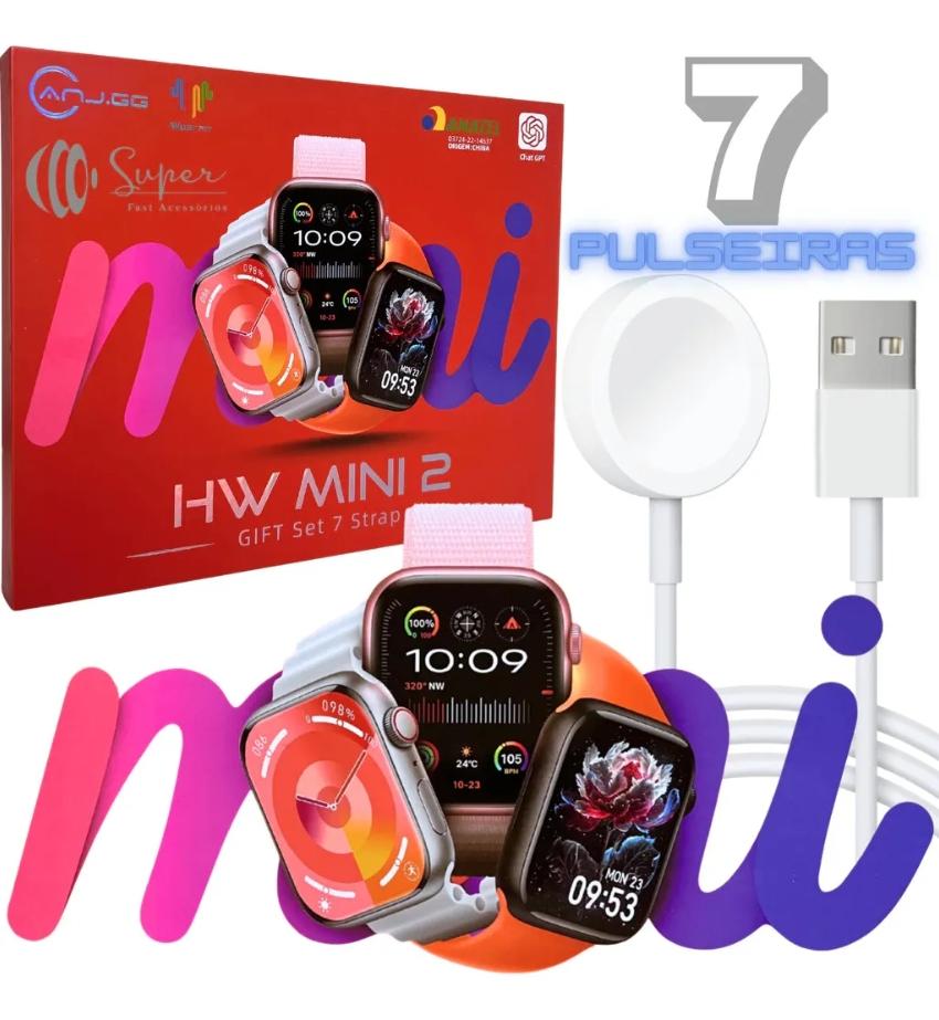 Transforme seu dia a dia com o novo Smartwatch Hw mini 41mm, um acessório completo que une estilo e tecnologia. Perfeito para pulsos finos, este relógio inteligente, disponível nas cores elegantes Rosa, Prata e Preto, oferece uma experiência personalizada com um incrível kit de sete pulseiras. Seja para o uso diário, atividades físicas ou eventos especiais, você terá a pulseira ideal para cada ocasião. Mantenha-se sempre conectado com as notificações do seu smartphone, monitore sua saúde com precisão — como passos, sono e frequência cardíaca — e aproveite a praticidade de um assistente pessoal no seu pulso, compatível tanto com celulares iOS quanto Android. Adquira agora o smartwatch Hw mini com 7 pulseiras e desfrute de um visual versátil e funcionalidades que facilitam sua rotina.